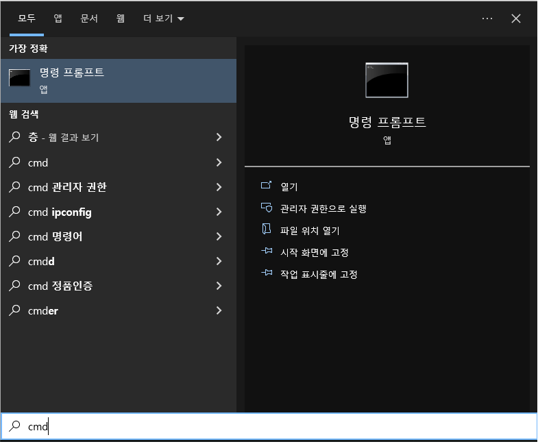 - '시작메뉴' 또는 '윈도우즈키 + R'로 실행창 실행 후 '명령 프롬프트' 실행